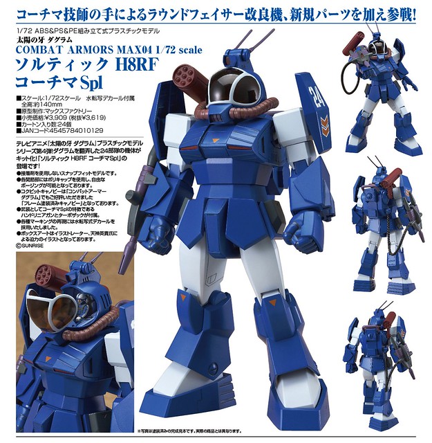 日MAXFACTORY玩具公司預計2014年12月推出COMBAT ARMORS MAX04 1/72scale ソルティック H8RF コーチマSpl,《太陽之牙》Soltic H8-RF Korchima Special模型商品,太陽の牙ダグラム(太陽之牙)於日東京電視台在1981年10月至1983年3月期間播放日本Sunrise公司製作的機器人動畫,全部約有75話,故事劇情當中並沒有絕對的壞人,而這部動畫片的監督是高橋良輔,高橋良輔後來也導演真實系機器人動畫名作裝甲騎兵。