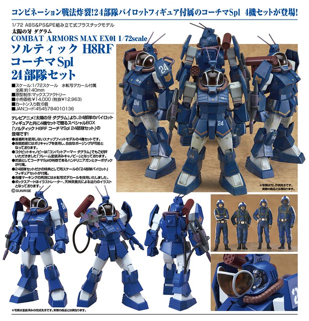另外有ソルティック H8RF コーチマSpl 24部隊セットSoltic H8RF Korchima Special 24部隊(暫時翻譯)的四個機體盒裝版將同時販售,Soltic H8-RF Korchima Special 24部隊SET(4機體裝)的售價約14,000元日幣,提供給喜歡太陽之牙動畫的玩具人參考。
