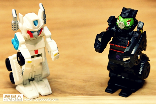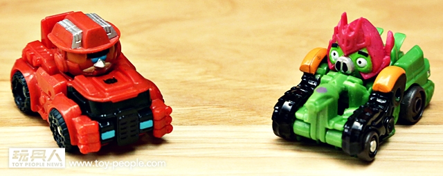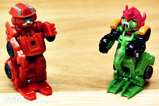▼ 變形的方式相當簡單,只要將鳥(或豬)的投向後扳,車子就會站立起來變成機人型態了。造型雖然比較簡單,不過有搭配上可動手的設計,而且造型也相當細緻喔!~