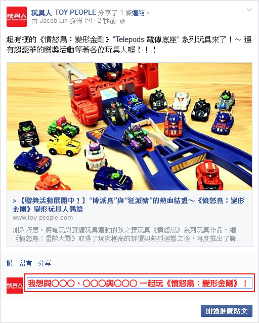 3. 到「玩具人」Facebook 的“博派鳥”與“狂派豬”的熱血結盟~《憤怒鳥:變形金剛》變形玩具人偶篇”留言區報到,留言tag 3位你的朋友,寫下“我想與○○○、○○○與○○○ 一起玩《憤怒鳥:變形金剛》!”(只要寫下"@"符號並加上朋友的FB 名字即可TAG)