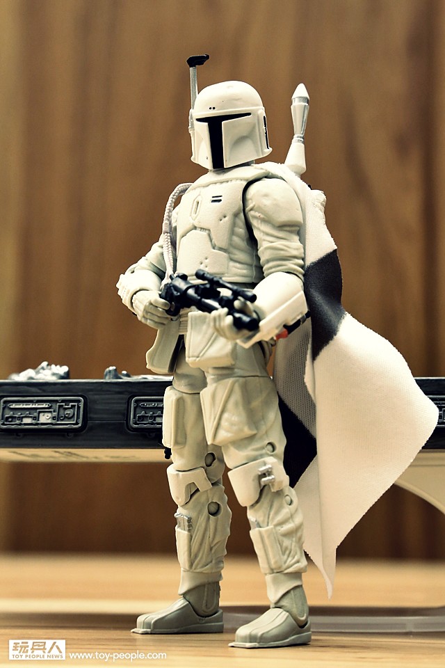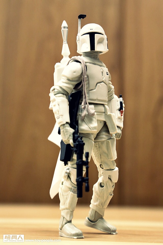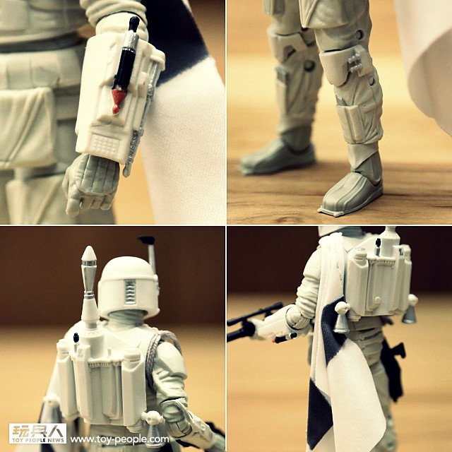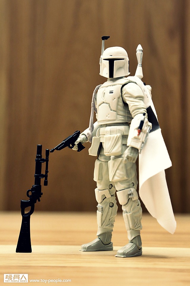 ▼ 波巴‧費特的造型一一刻畫出來。包含了相當經典的手部勾索發射裝置,以及提供其難纏的飛行攻擊的火箭背包。除此之外,左肩上的小披風使用布料製作,質感超棒!~