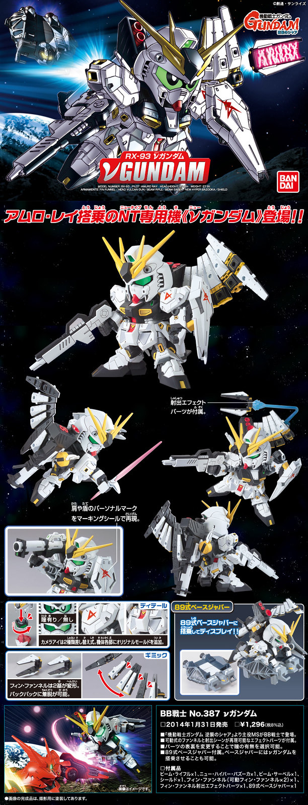 ▼ BB戰士No.387 ν鋼彈,這是歷來人氣最高的鋼彈主角機,全新版本採用和MG Ver.Ka同樣的風格設計,細節表現令人激賞,背上的翼狀精神感應砲,有兩枚可以分離出來,重現動畫飛來飛去的攻擊場面,適合滿腦子怪點子、想法飛來飛去的你。