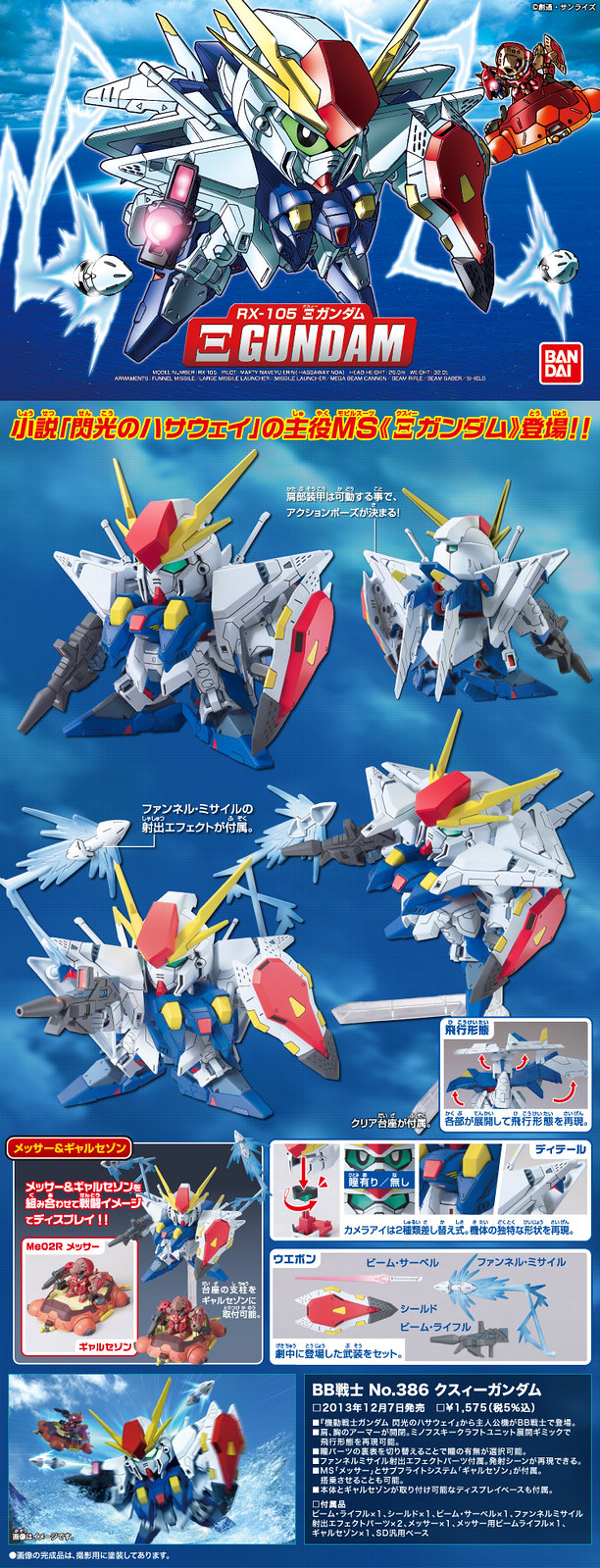 ▼ BB戰士No.386 RX-105Ξ鋼彈,(Ξ是希臘文第14個字母,唸做克希)出自小說《機動戰士鋼彈閃光之哈薩維》,也是到目前為止,Ξ鋼彈唯一被立體化的鋼普拉作品,造型兇猛無比、酷炫滿分,適合全身霸氣外洩的你。