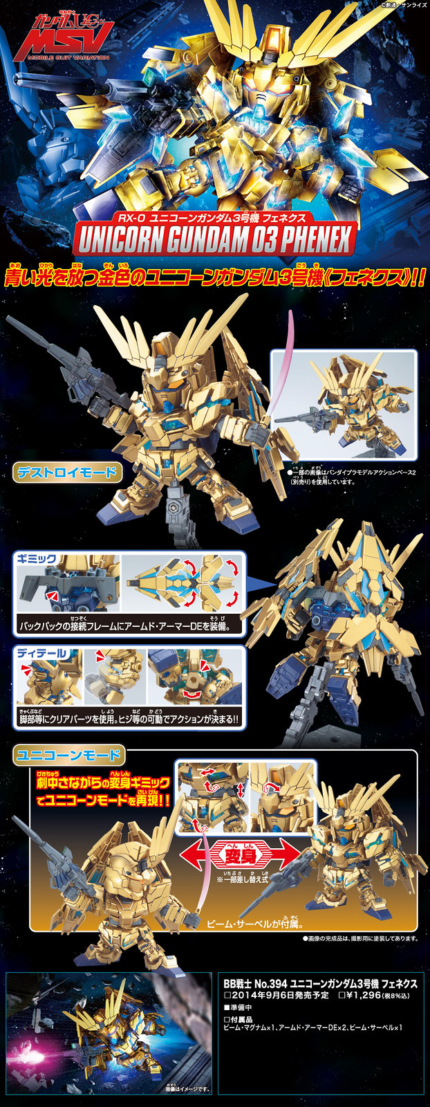 ▼ BB戰士No.394 獨角獸鋼彈3號機「鳳凰」,本傳中未登場的幻之機體,頭上的角可以進行孔雀開屏,裝甲之下的精神感應框體閃爍著奇幻藍光,最適合光芒萬丈、永遠吸引眾人目光的你。