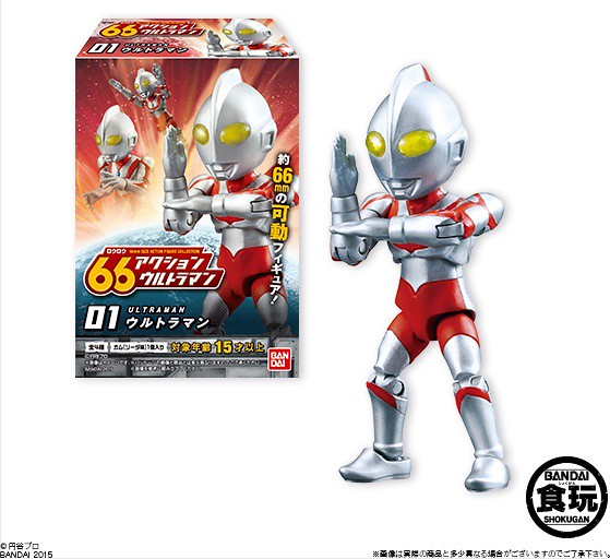 日Bandai萬代玩具公司的66アクション 66可動食玩系列預計明年2015年1月推出ウルトラマン 超人力霸王 迷你可動盒玩(暫時翻譯),將收錄有ウルトラマン、ウルトラセブン、ウルトラマンギンガストリウム和バルタン星人等等四種類超人力霸王特攝角色,縮小製作成盒玩尺寸大小就是標榜著有約66公厘(6.6公分)的大小,全身都有多處的可動關節,附有交換用手首、武器等等配件,單盒售價約400元日幣,喜歡超人力霸王系列的玩具人可以參考一下歐。