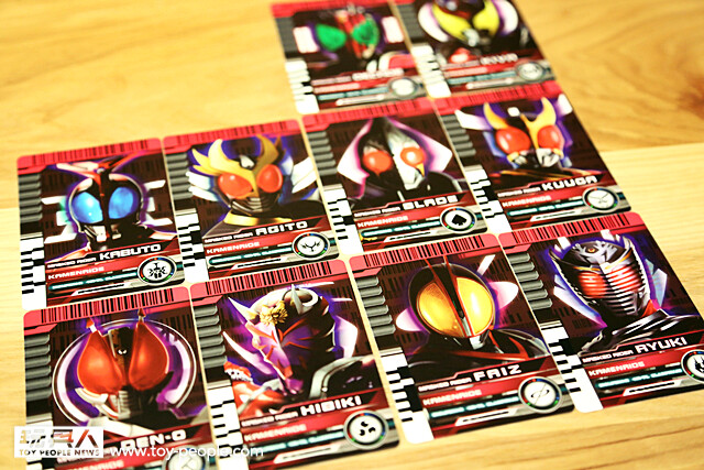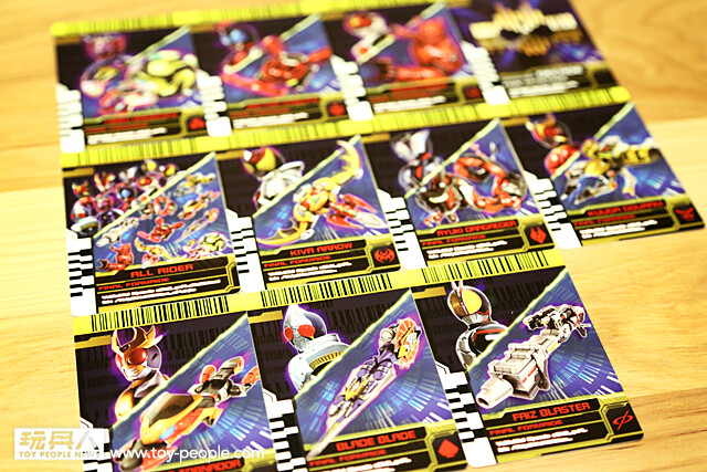 ▼ 分開販售的卡片組合「RIDER CARD」,不曉得實際總數是多少?小編手邊一共有30 張卡片,包含了10 張騎士(KAMEN RIDE,KR)卡、9 張ATTACK RIDE (AR)卡片以及11 張FINAL FORM RIDE (FFR)卡片。卡片使用的是強力的塑膠材質製作,拿在手上的時候手感很棒,插入、拔出卡片的時候也不容易折損。圖片上的圖樣印刷的相當精美,圖像清晰銳利。