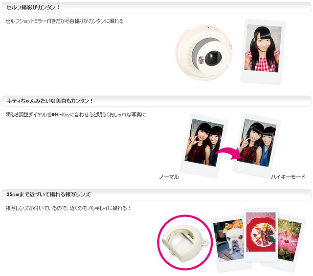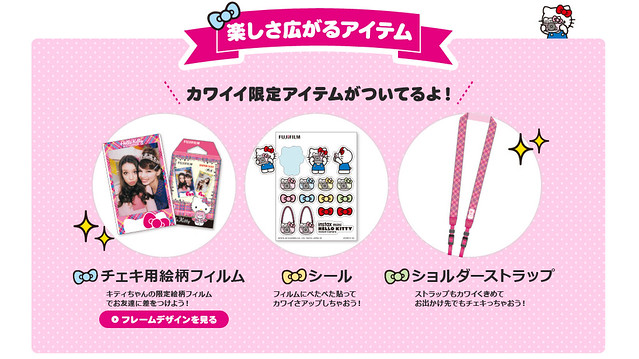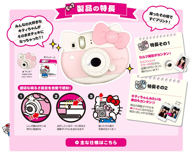 這一使用經典的凱蒂貓臉譜造型作為設計的限定款式,內建能夠偵測光源是否充足的提示拍攝燈、位於鏡頭旁方便自拍的鏡子設計,以及像是Hello Kitty 風格的美白功能...三大特色,並附贈一款能夠在35cm 拍攝的近距離鏡頭。除此之外,這一個限定版本還將同捆附贈限定版本的相機背帶、Hello Kitty 40 週年裝飾專用相片與裝飾貼紙。充實豐富的內容絕對值得各位Kitty 迷擁有~ 千萬別錯過嘍!