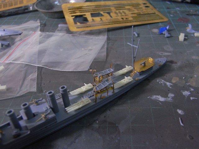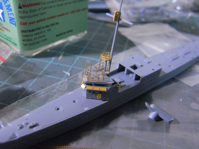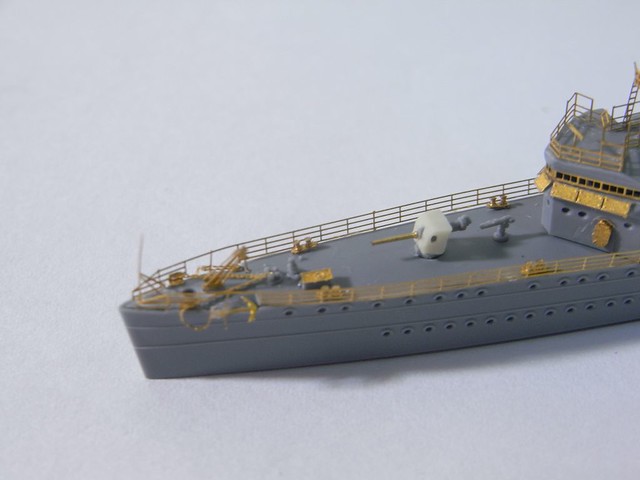 ↑ 艦首部定裝,內附的蝕刻片忠實呈現了艦首吊車、船錨與錨鍊等細節。