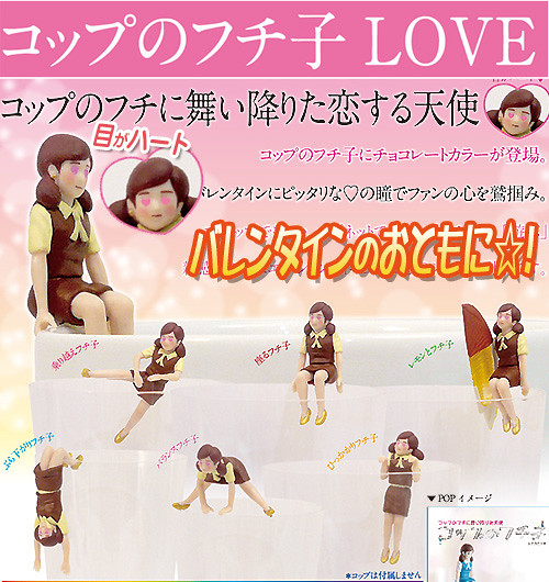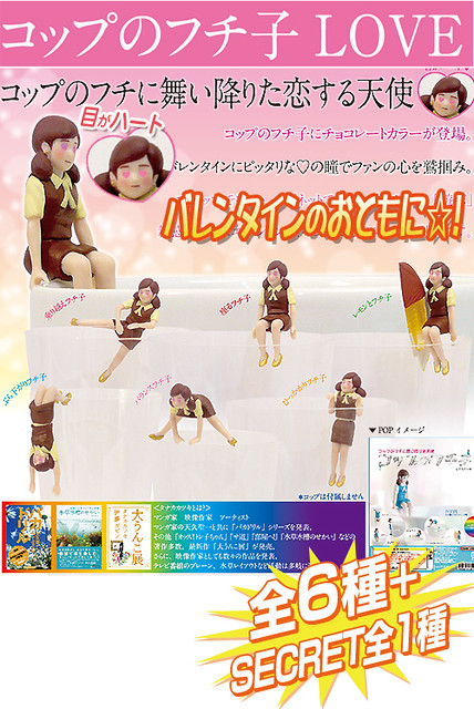 日奇譚俱樂部玩具公司大受歡迎的杯緣子(コップのフチ子)系列預計2015年1月中旬推出コップのフチ子 LOVE チョコレートカラーver. 愛心眼的杯緣子 巧克力色版本(暫時翻譯),將杯緣子依照「情人節」的元素,把眼神變成了”愛心眼”的爆笑模樣、以及將OL 服裝改變為巧克力配色來呈現。全套將有6 + 1隱藏,一共七種版本的杯緣子,單款售價約300元日幣,喜歡杯緣子系列的玩具人可以參考一下喔!~