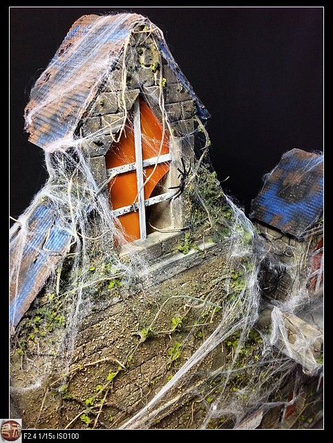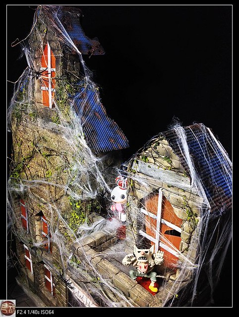 ↓ 歐式的廢棄舊洋房令人卻步,誇張的蜘蛛網和蜘蛛加強陰森感, 這些文具店的萬聖節佈景商品可以很容易買到