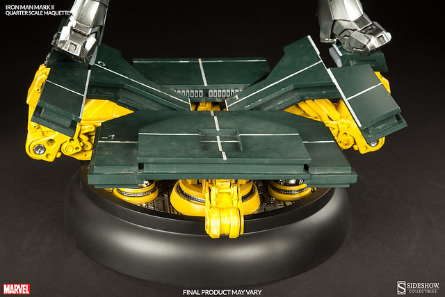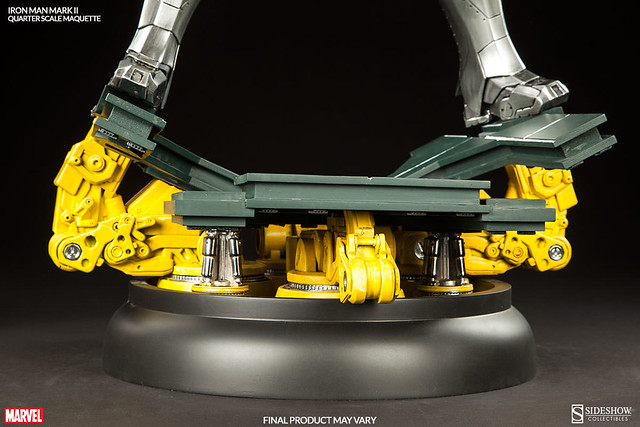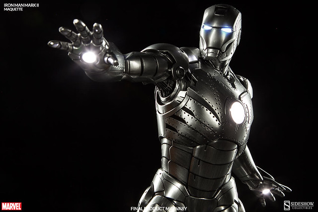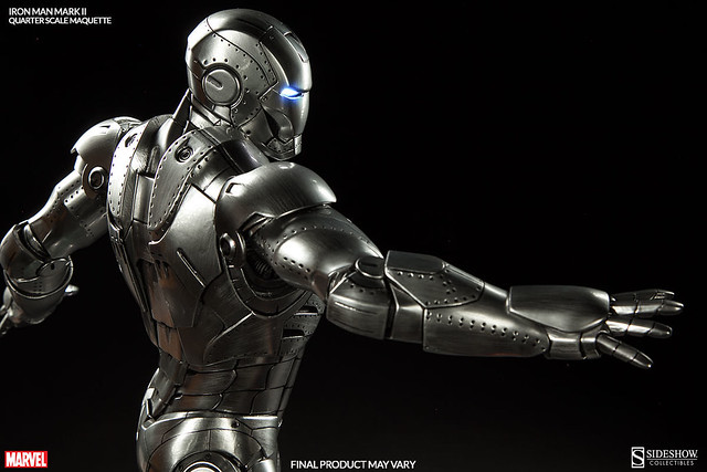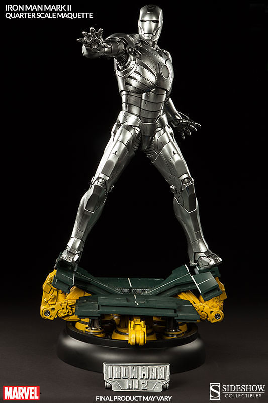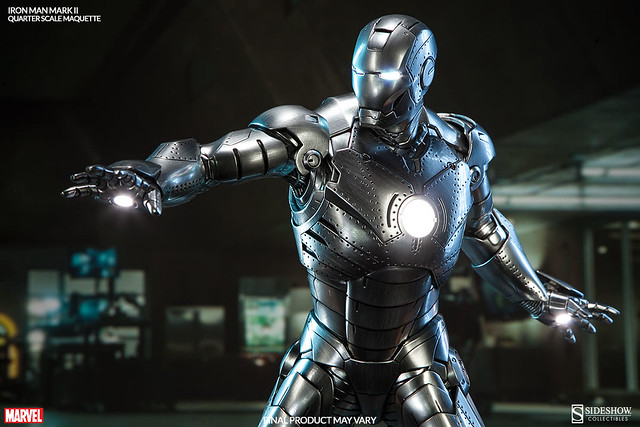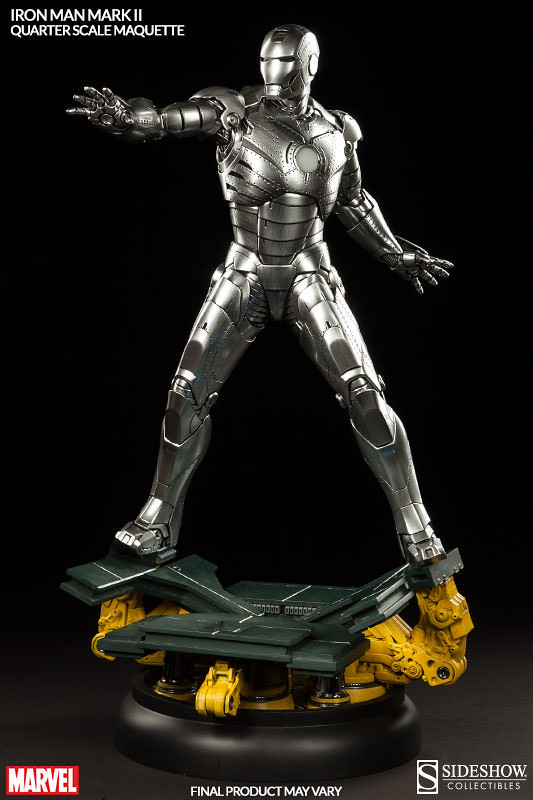 完全組裝完畢並準備進入測式的鋼鐵人馬克2,站在東尼工作室中的整備台上,雕像的尺寸採用了兼具觀賞最佳尺寸與魄力的1/4 比例,並施以高光澤的金屬質感的塗裝;雙眼、胸口以及雙掌皆具備了LED 的發光機制,地台上附屬了「Iron Man Mark II」(鋼鐵人馬克2號)的名牌。充滿魄力與精緻細節的傑作,絕對值得收入各位玩具人的鋼鐵人收藏!!!