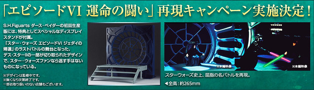 這一款作品,預計將與2015年夏天所推出的S.H. Figuarts《星際大戰》路克‧天行者組合為《星際大戰六部曲:絕地大反攻》經典的父子對決場景。將在S.H. Figuarts 達斯‧維德推出初回限定特典“死星的西斯大帝王座”來搭配。完整重現經典原作,各位喜愛《星際大戰》玩具系列的玩具人,可千萬別錯過了喔!~