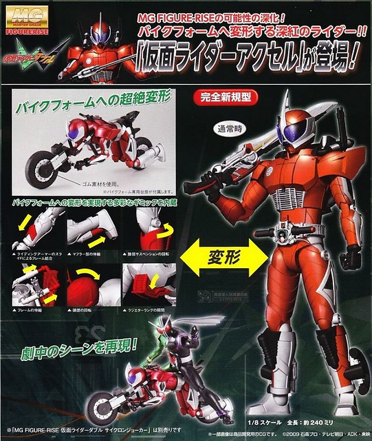 ▼ MG FIGURERISE系列1:8組合模型,這是《假面騎士W》中的第二騎士:江湖人稱A哥的假面騎士Accel,腰帶上類似機車龍頭的把手,正是變身啟動器,只要油門催落去就會變形,不但可以變身為假面騎士,還可以第二段變形成機車。「因為他很機車,所以被騎走了」說的正是這一位。