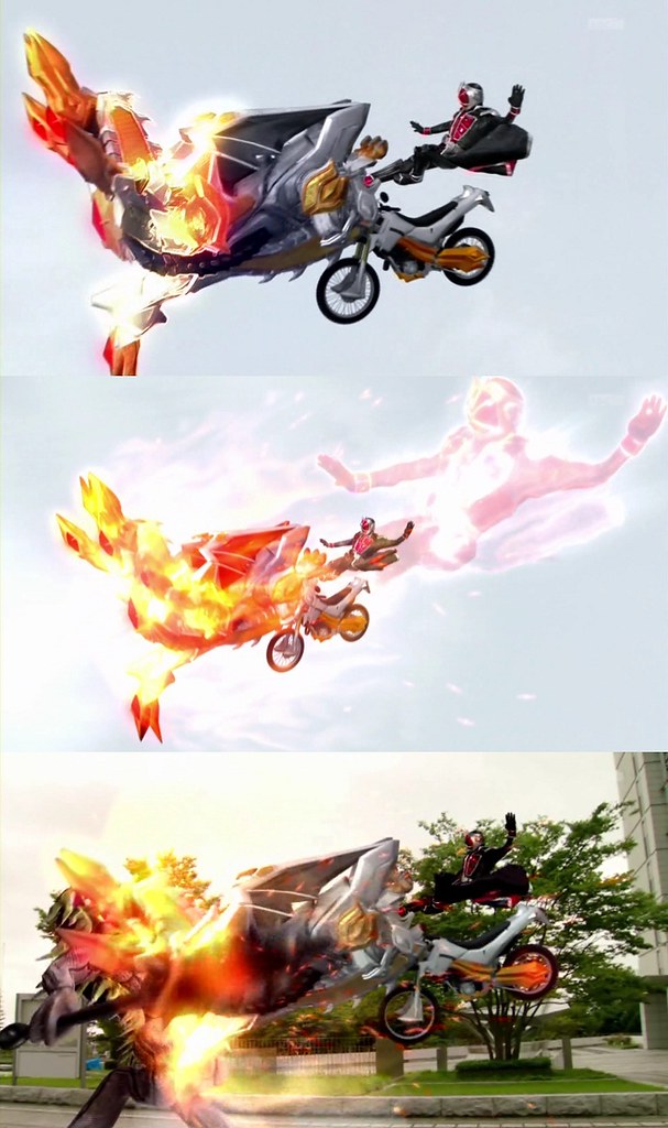 ▼ 假面騎士Wizard在Underworld異世界中,可以通過指環召喚魔法巨龍,而且還可以騎上機車後和龍合體,施展出超級大絕招「魔法巨龍騎士踢」,不但是魔法師,同時也是龍騎士,真是帥到爆表了啊~~~