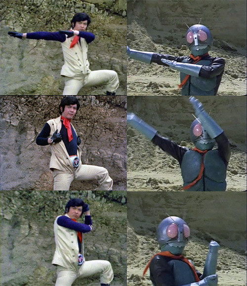 史上第一次招牌動作變身,其實是從假面騎士二號開始。這背後的原因相當耐人尋味。當時飾演一號的藤岡弘,因為在一次演出中受傷,必須暫時休養,劇組只好在劇情中安排他到歐洲出差,臨時安插假面騎士二號上陣。不過,飾演二號的佐佐木剛,雖然身手不凡,卻不會騎機車,只好改成比手劃腳,然後向空中一躍,沒想到,這種演出大受歡迎,以致於後來所有假面騎士一登場,也都要來這麼一下。想想也是,畢竟,每次都要騎上機車或從高樓跳下來真是太為難假面騎士了。