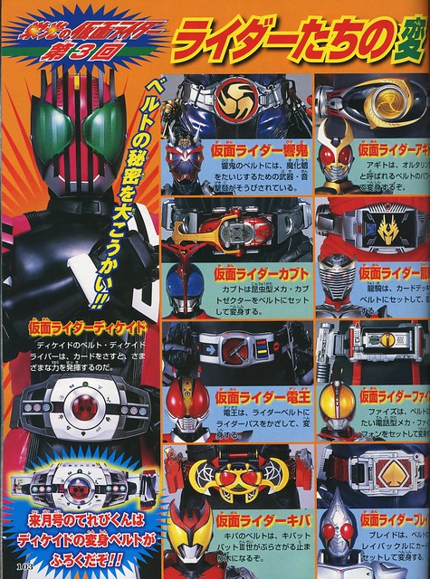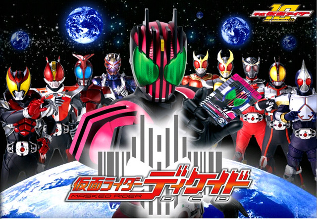 ▼ 《假面騎士Decade》是平成騎士十週年紀念作,同時也是一部非常有趣的大亂鬥時空穿越劇。Decade這個名字,其實就是「十年」的意思。主角門矢士穿梭於空我、顎門、龍騎、555、劍、響鬼、Kabuto、電王和Kiva九個平行宇宙之中,假面對假面、騎士打騎士,連《侍戰隊真劍者》也來參一咖,真是太熱鬧了。