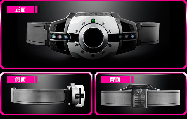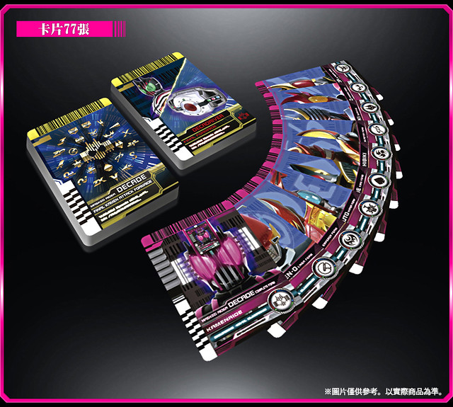 ▼ 《假面騎士Decade》的故事主題是「破壞所有,連接一切」只要打倒了其它假面騎士,就能將其能力化為卡片,包括平成騎士的各種型態、以及必殺技等等,只要將卡片插入DECADRIVER變身腰帶中央的插槽,就能重現發動各種騎士卡與招式卡的聲光特效,和原作配音一模一樣,聽得讓人雞皮疙瘩都起來了。