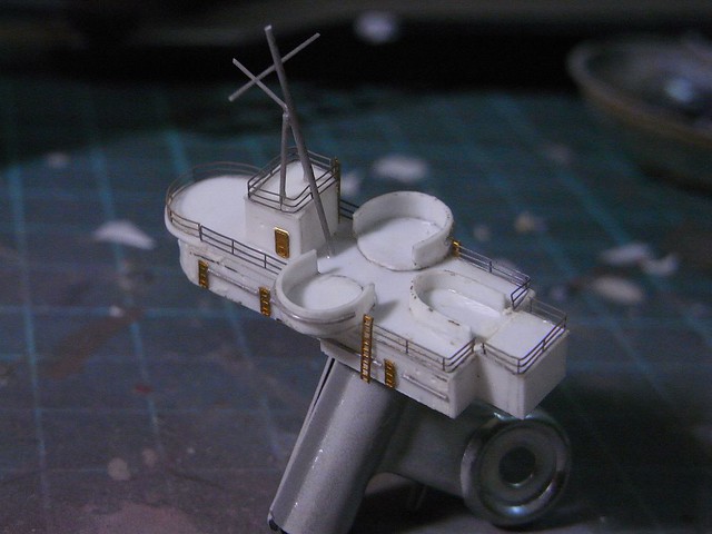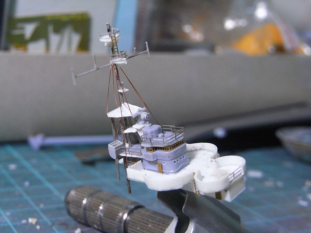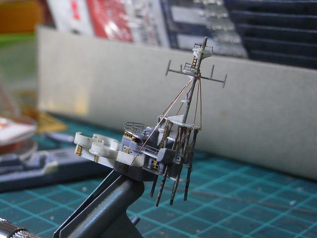 ↑艦橋部增設細節,由於丹陽桅杆與雪風桅杆在構造上完全不同,因此利用膠絲與膠版重新搭建。