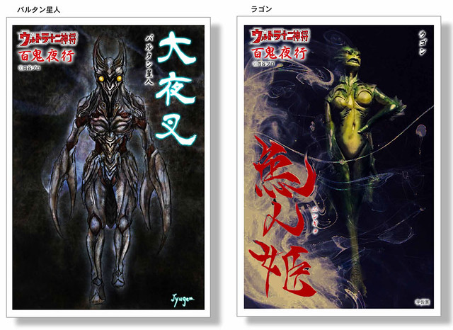 十分受到超人力霸王玩具人們歡迎的『ウルトラ十二神将』系列,這次將以特攝劇中超人力霸王們的反派角色以『百鬼夜行』系列來對應『十二神将』系列,首先巴爾坦星人化身為『百鬼夜行』中的大夜叉,而拉岡(ラゴン)為『百鬼夜行』中的魚人姫,大夜叉(バルタン星人)約有17.4公分、魚人姫(ラゴン)約有18.4公分,2體一同發行售價約11,880元日幣,≪2体セット特典≫デザイナーズポストカード(設計師的插畫明信片),喜歡『ウルトラ十二神将』系列的玩具人可以參考一下歐。