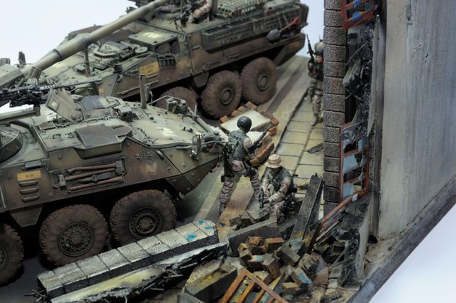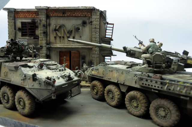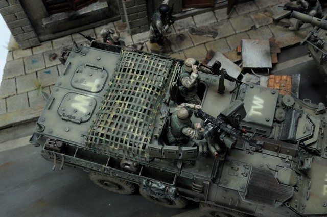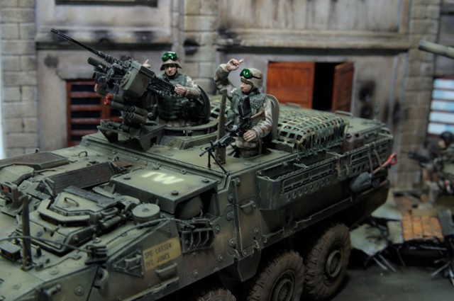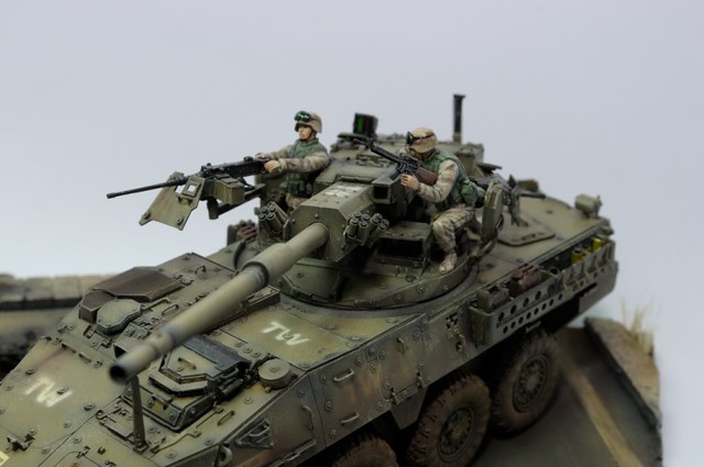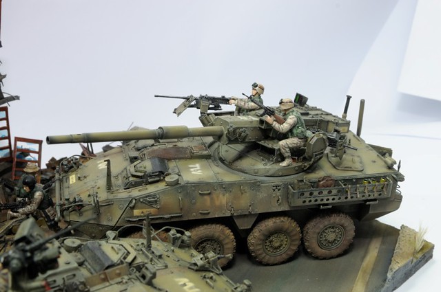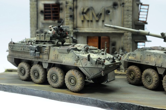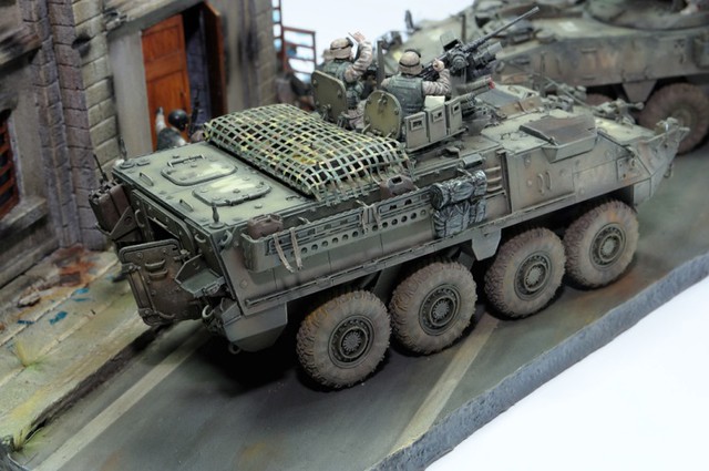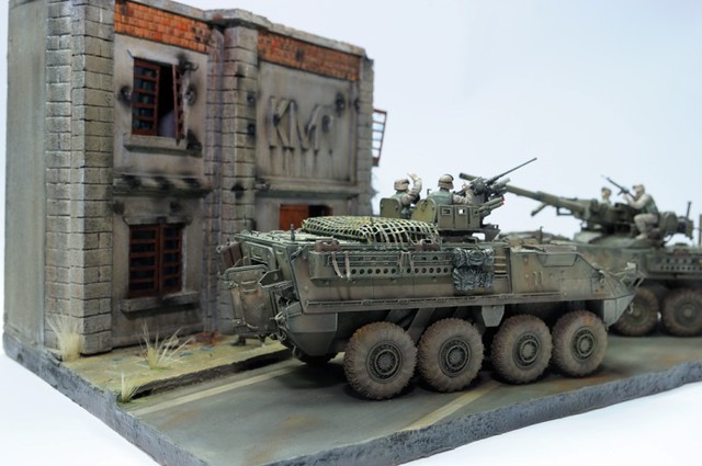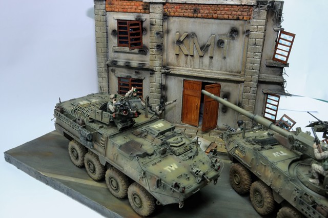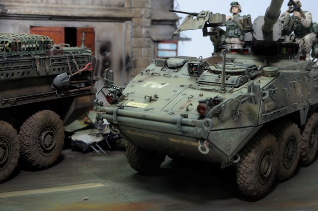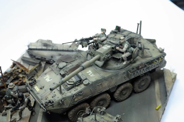 載具使用AFV Club 1/35 Stryker M1126 ICV 、 M1128 MGS;兵人使用 Dragon 1/35 US delta force (4人)、 marines (4人);場景搭建使用珍珠板、冷凍板跟膠板。