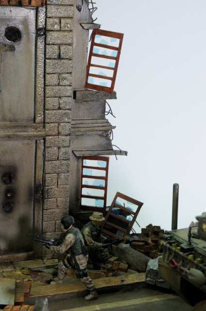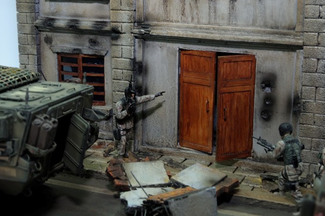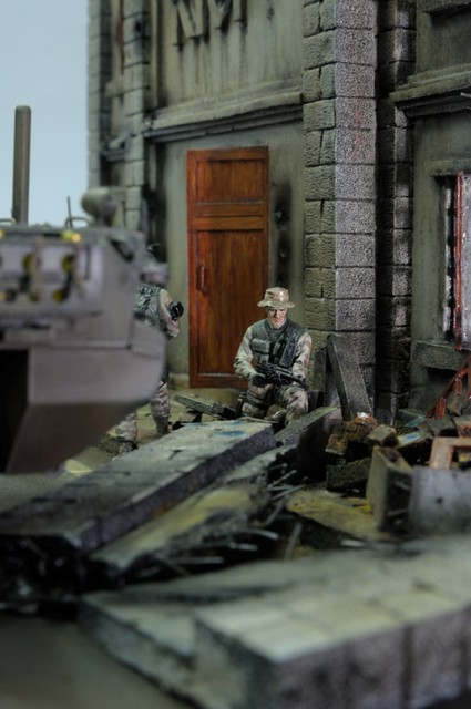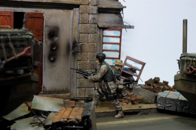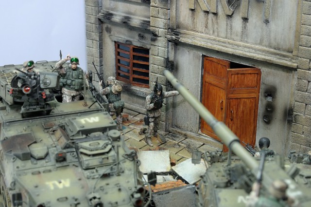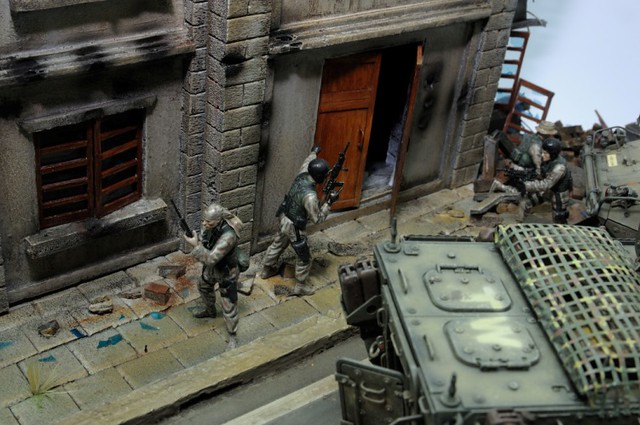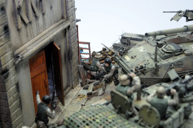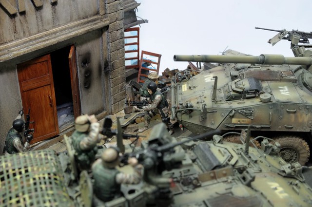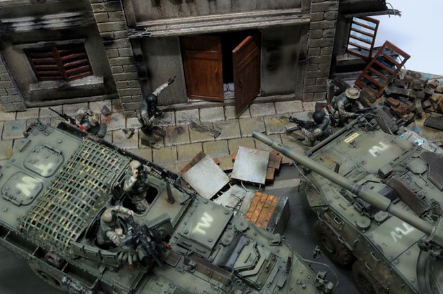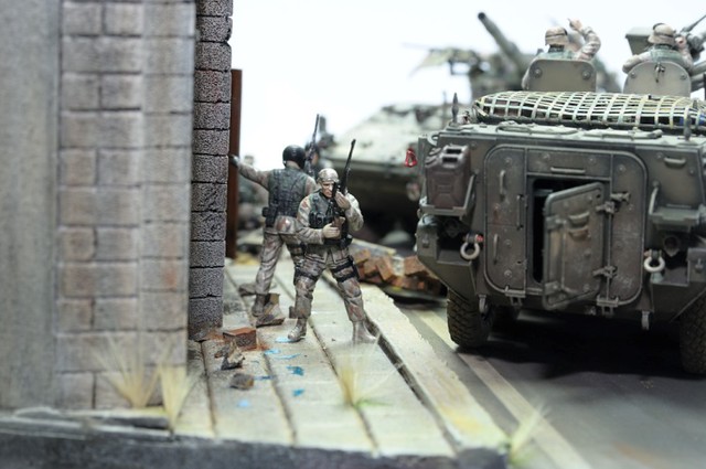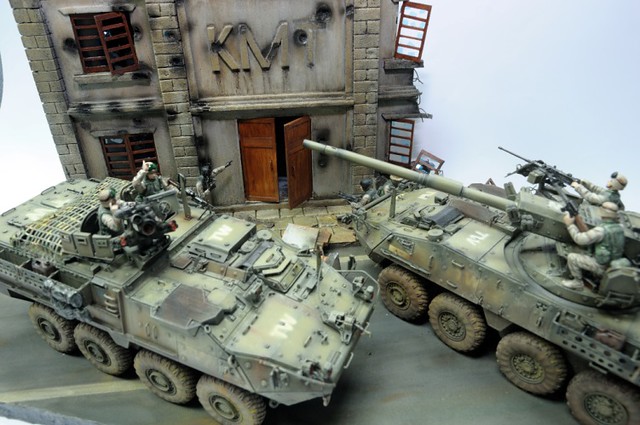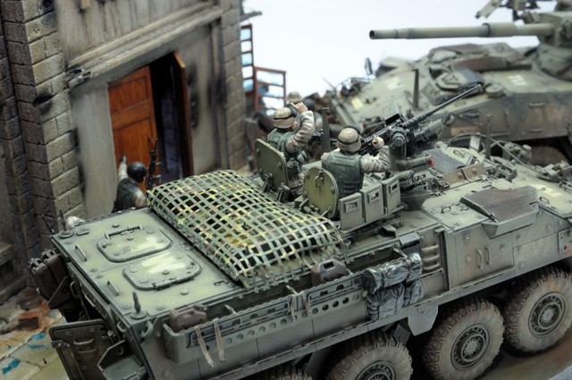 載具使用AFV Club 1/35 Stryker M1126 ICV 、 M1128 MGS;兵人使用 Dragon 1/35 US delta force (4人)、 marines (4人);場景搭建使用珍珠板、冷凍板跟膠板。
