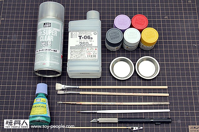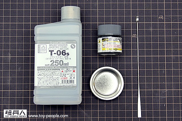 我們這次選用郡式出產的Mr.Color Gundam Color UG09吉翁灰(半光澤)、調色棒、塗料皿以及硝基漆溶劑。這邊特別介紹一下,我們所以用的蓋亞T-06硝基漆緩乾型溶劑。筆塗容易造成筆觸明顯的原因除了上面提到的筆跡重複之外,另一個因素就是硝基漆速乾。漆膜一乾在疊色上去,筆觸就會很明顯。