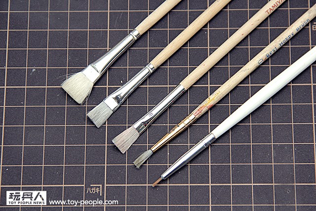 平頭畫筆,主要的用法就是塗較大面積的平面,而且依照面積大小的不同,更換不同尺寸的平頭筆刷,可以初步減少因為筆觸塗繪重疊所造成的筆痕,這就是造成明顯筆觸跟後續造成漆膜過厚的原因之一。圓頭畫筆,主要的用法就是針對比較難上色的轉折內角進行塗繪。面相筆,就是針對細節進行塗繪。