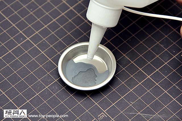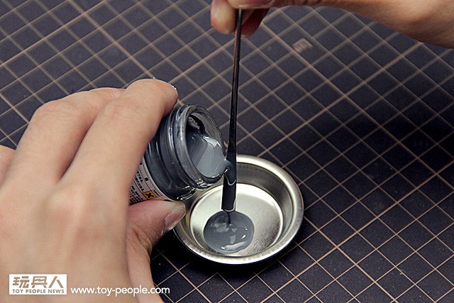 ▼ 攪拌均勻後,下一步就是利用調色棒作輔助,把漆料倒入塗料皿中。