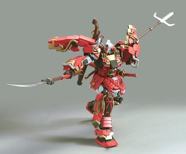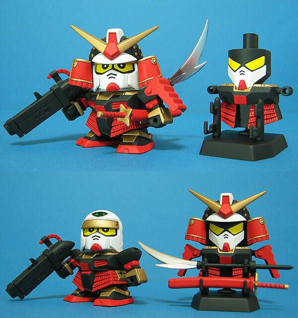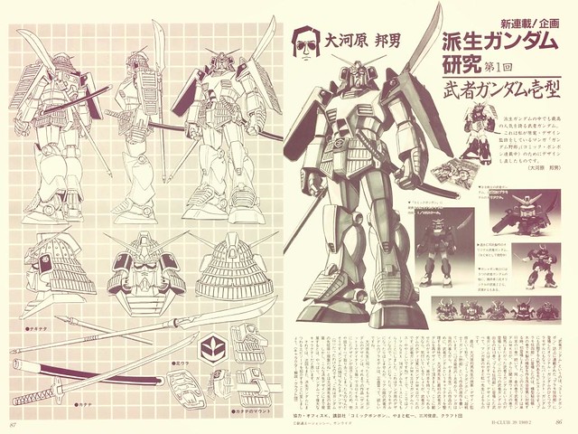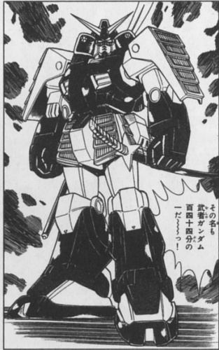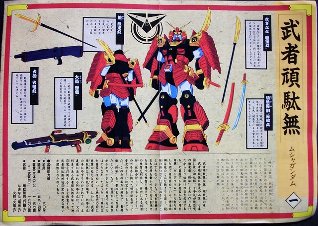 鋼彈也不例外,雖然線條更加洗鍊,但例如頭部和裙甲等設計,基本上還是從戰國武者變化而來的,特別是鋼彈著名的V字天線,明顯就是日本鎧甲「前立」(まえだて,頭盔前的裝飾物)的概念。順著這個方向更加強化,於是有了武者鋼彈的設計,兩者的融合根本就水到渠成,再自然也不過了。