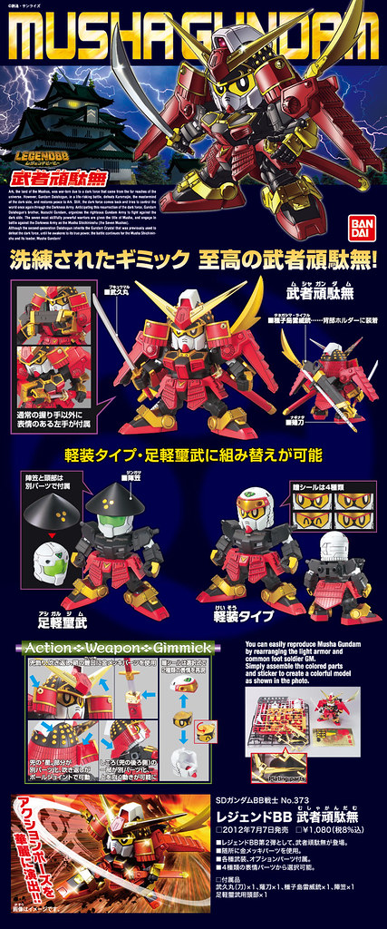 ▼ 2012年7月發售的LEGEND BB戰士NO.373武者頑駄無,以最新技術重新開模,是目前為止最完美的BB武者頑駄無。不但附有4組眼睛可以選擇更換,同時還附了吉姆頭和斗笠,可以變身成「足輕璽武」(足輕是步兵的意思,而璽武就是吉姆的同音漢字),這個不買三盒怎麼行?