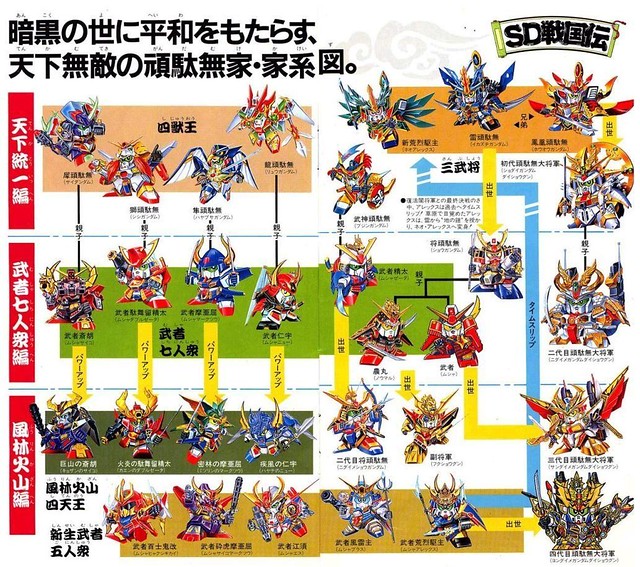 從1988年第一部《SD戰國傳 武者七人眾篇》開始,一直到2009年的《SD戰國傳 武神降臨篇》,連續20年幾乎是每年一部不斷推出。每一篇的故事結構,說穿了大同小異,主要就是頑駄無軍團和暗黑軍團永無止盡、沒完沒了的正邪對決。一開始就像收集七龍珠一樣到處找伙伴,然後打小頭目、中頭目,最後人馬齊備,召喚出傳說中的大將軍,和大魔王決一生死。簡單說就是一個RPG遊戲的概念。