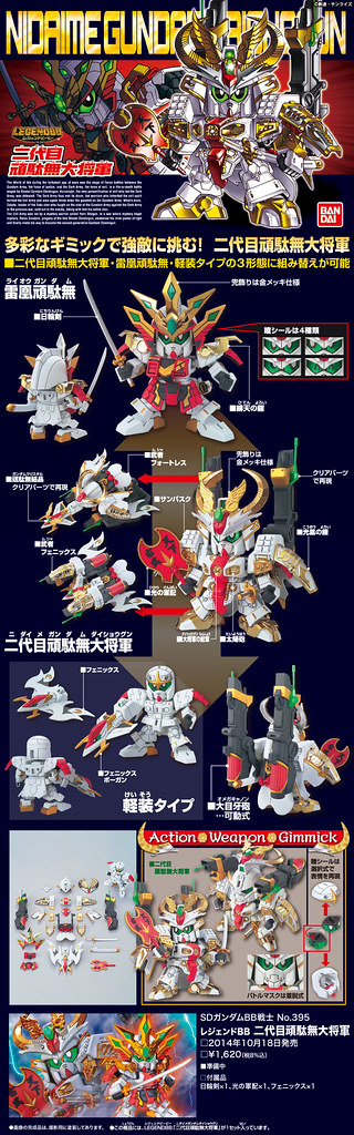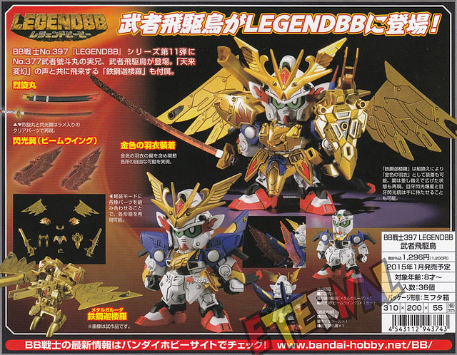 ▼ BB戰士NO.397 LEGEND BB武者飛驅鳥,即將於明年一月推出,這是NO.126武者飛驅鳥的再製版,以V2鋼彈為原型,最早登場於《七人之超將軍篇》,平常除了「輕裝型態」和鎧甲著裝之後的「武者型態」之外,只要高呼一聲「天來變幻」,即能穿上名為「鋼鐵迦樓羅」的金色鎧甲。
