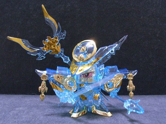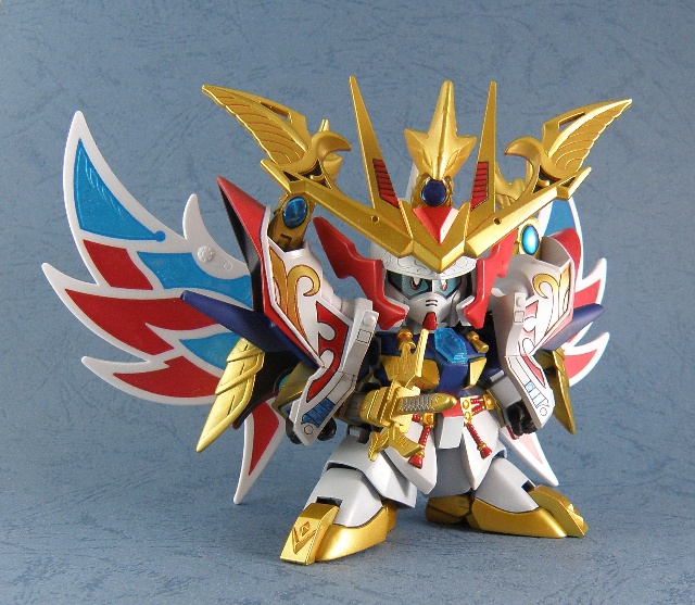▼ BB戰士NO.120新世大將軍,是《傳說之大將軍篇》最後登場的最強角色,除了大量電鍍黃金零件之外,額頭心鳳、左肩技鳳、右鳳體鳳,象徵心、體、技三位一體的結晶鳳凰,則是由透明零件所構成。最厲害的是背後的飛翼,由多色成形技術製成,同時將紅、白、透明藍三種不同材質一體成型。整體用料相當豪華。