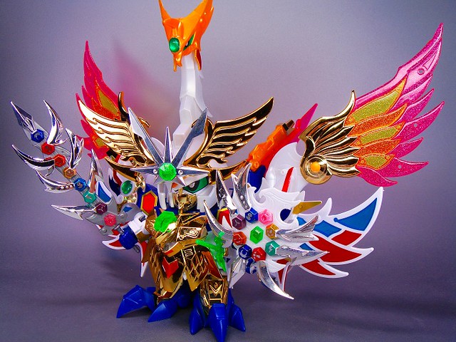 ▼ 武神天零王超輝羅鋼形態,這個型態要收集到三組超夢幻逸品才能組成,一組是限定版「天零頑駄無超輝羅鋼形態」,另一組則是限定版「鐵機武者鋼丸青銅形態」,除了上面這兩組之外,第三組則是「號斗丸結晶輝羅鋼天空鳳鳯翼形態」。小編有生之年只親眼看過兩次,看完之後,一整個月什麼都看不見,真是閃到眼睛都瞎了啊。