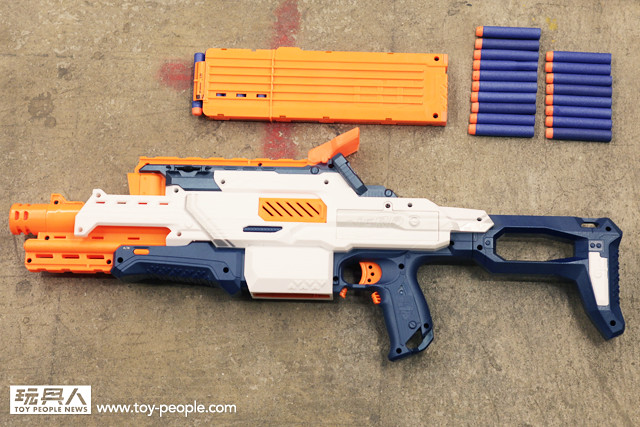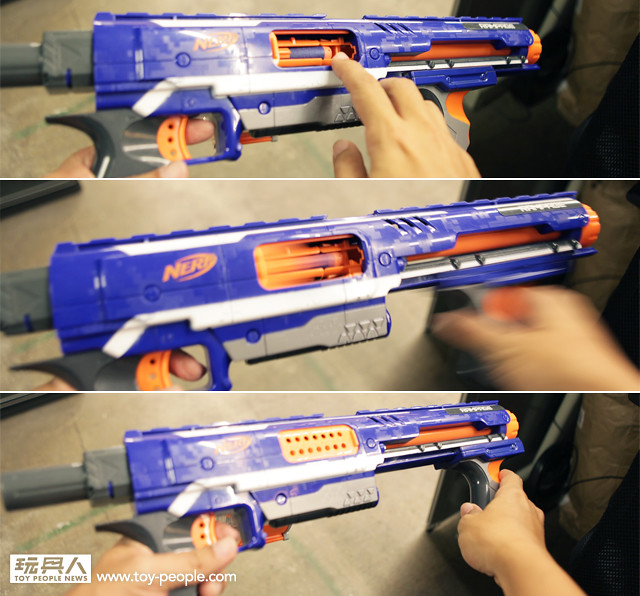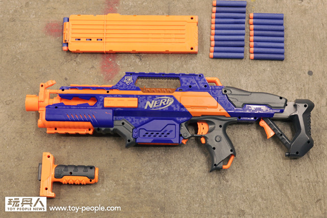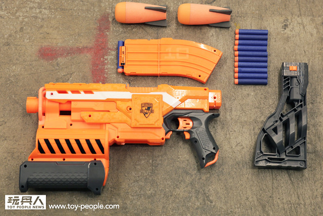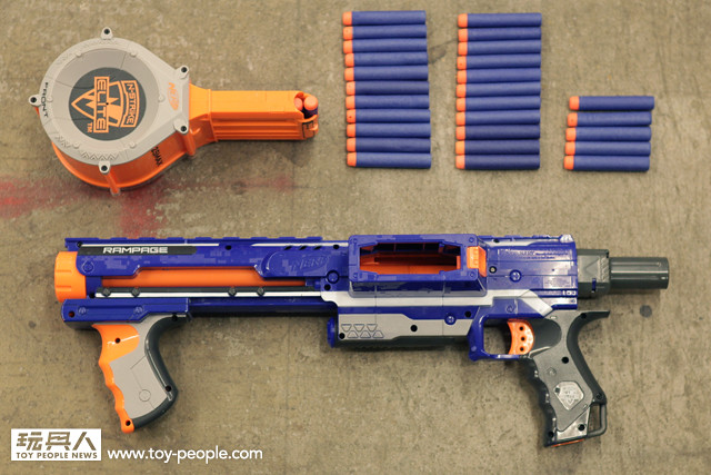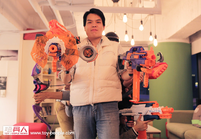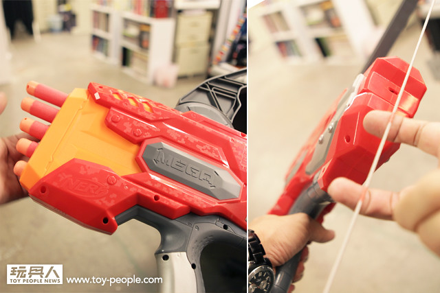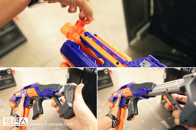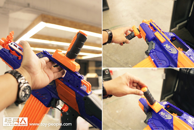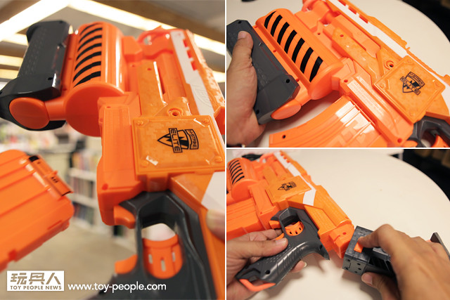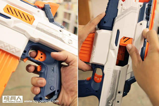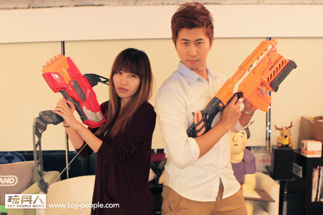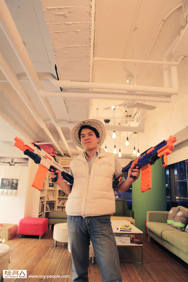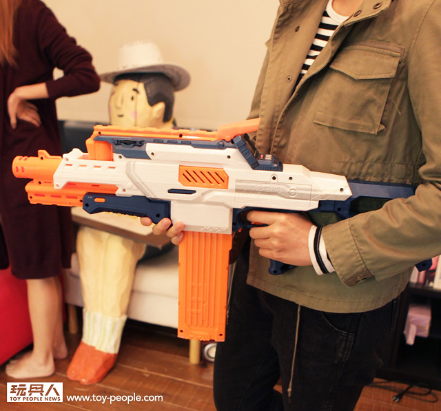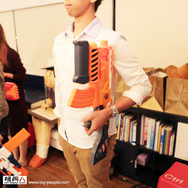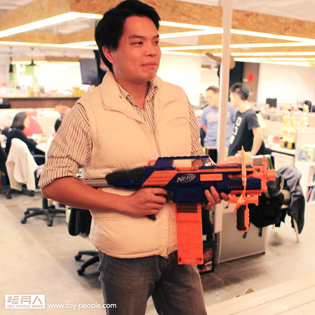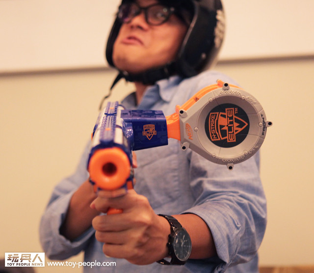▼ 來解析ㄧ下,山P手上這把武器是”速擊連發機關槍”! 特色在於擁有超暴力的“射速”,是目前市面上NERF 系列連發射速最快的武器,每秒可發射三發,號稱秒殺神器!! 有夠兇狠!