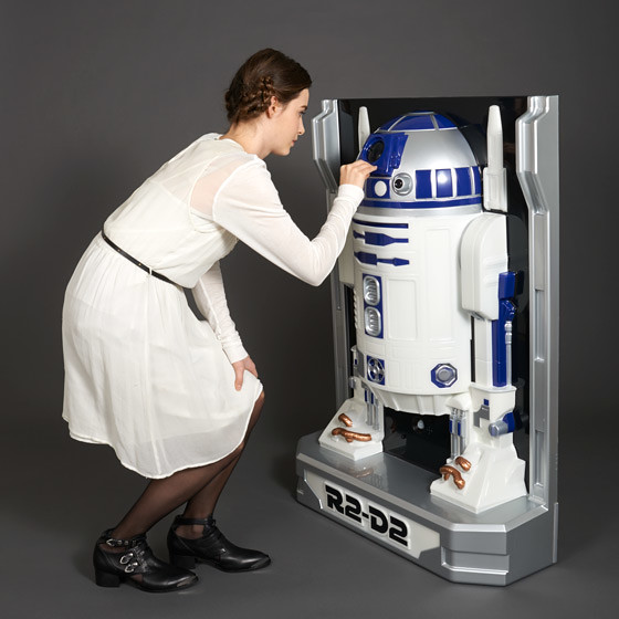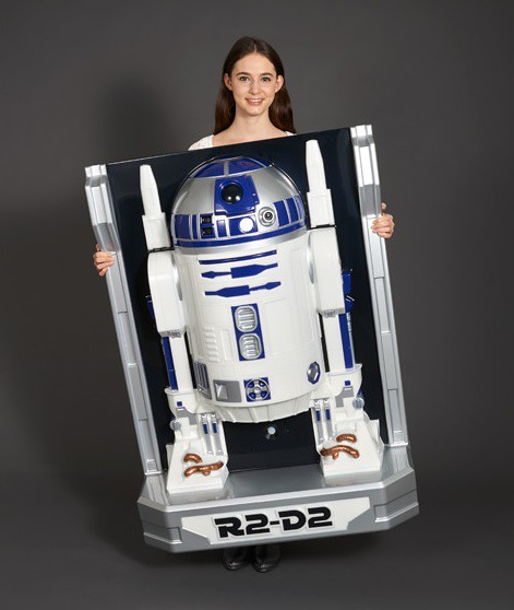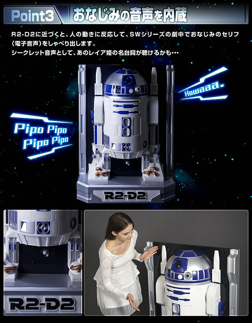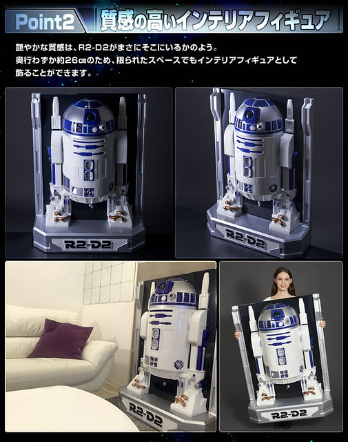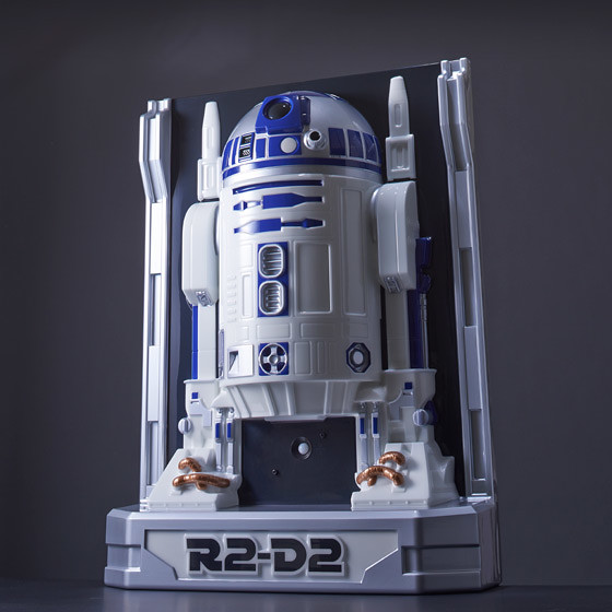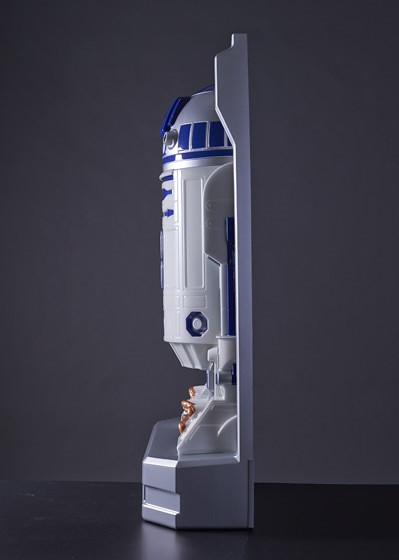 「3D WALL FIGURE」系列是新蒐藏品線,是將角色人物製作成立體牆面,方便家庭蒐藏和展示,這次以科幻電影星際大戰中的機器人角色R2-D2 原尺寸比例製作,尺寸H約1,140mm×W約840mm×D約260mm※R2-D2全高約960mm(去除台座),R2-D2內附有感應器,當有人走近它的時候便會發出聲音,機體內藏有約14種以上不同聲音。