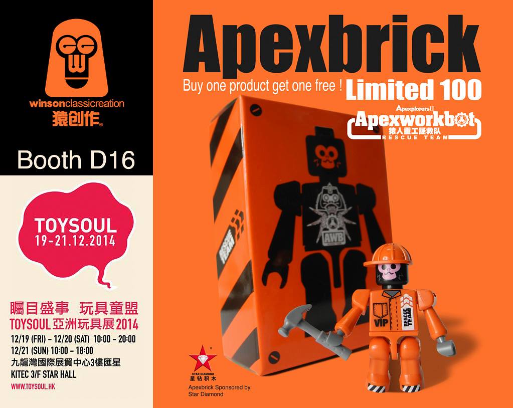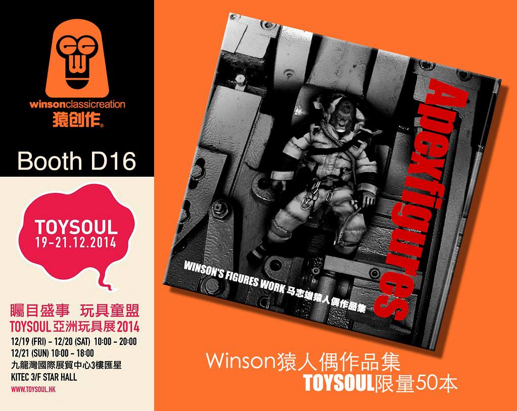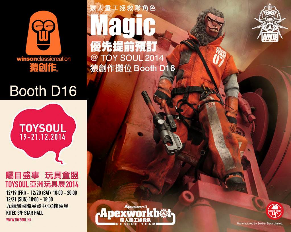 又一設計師玩具品牌推出強勢限定品啦!沒錯,由Winson Ma(馬志雄)老師所創立的「猿創作」(Winson Classic Creation)將在將在12 月19 日至21 日於「TOY SOUL 2014」期間在會場D16 攤位隆重推出全新1/6 比例猿人重工拯救隊的最新角色「Magic」的預定。有成功預定地玩具人還可以優先保留(生還者舊化版)嬰兒figure一個,同時還可以獲得一款猿人重工積木公仔。此外,於TOY SOUL 2014 會場還會有一套六隻的極地猿人仔家族套裝、12 吋搪膠猿人Wild Jungle figure 拍賣版作品、猿重工最佳拍檔Double - U、多款Necoco chocolate Cat、以及即將在一月中出貨的Otto 最後預購機會。
