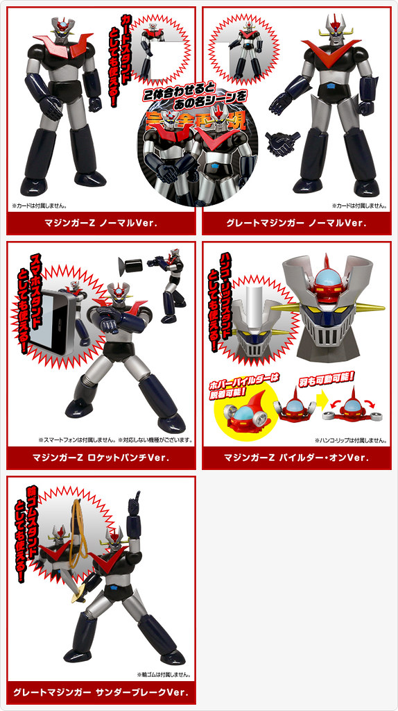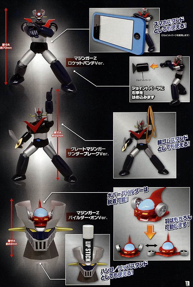 這一款作品名為「魔神Z 與 金剛大魔神 超級玩偶系列」(暫譯,マジンガーZ&グレートマジンガー スーパーフィギュアコレクション),將以『無敵鐵金剛』為主題設計,將原作中各種熱血魄力的元素,與桌上小物的機能結合;比方說握手的「魔神Z 與 金剛大魔神」可以用作名片放置架、發射金剛飛拳的經典姿勢可以當手機架...等,兼具機能與熱血的夢幻創意結合,絕對是熱血機器人迷必備的辦公小物!!!