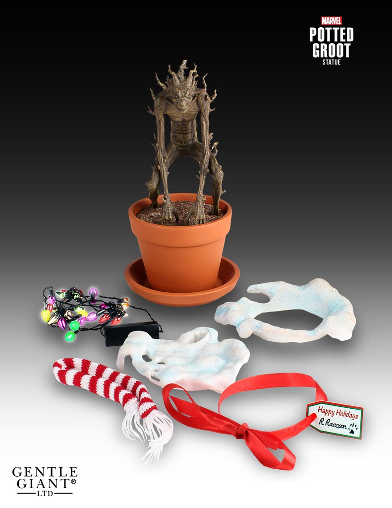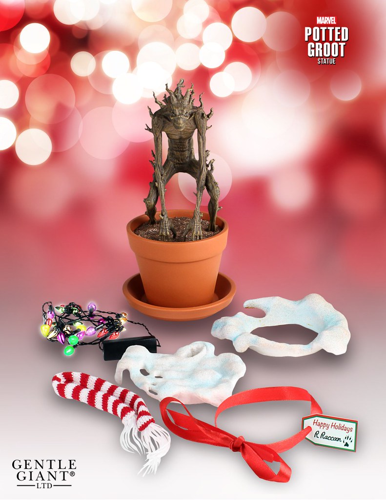 Gentle Giant 趁著耶誕佳節大家都會裝飾耶誕樹,順勢推出了這一款盆栽格魯特 漫畫ver.(Potted Groot – Comic Version),重現了格魯特藉由他的麻吉“火箭浣熊”(Rocket Raccoon),重新將嫩枝種植之後在盆栽中重生的模樣。做為耶誕佳節限定商品,當然不能錯過應景的裝飾啦!~