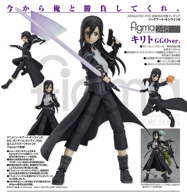 日MAXFACTORY玩具公司的figma可動系列預計今年暑假檔期推出figma キリト GGOver.《刀劍神域》桐子 GGO版本(暫時翻譯),《ソードアート・オンライン》(刀劍神域)是川原礫著作、abec插畫的日本輕小說作品,由電擊文庫於2009年出版發行,中文繁體版則由台灣角川發行,在日本發行總數超過1000萬多本,2011年宣佈將製作動畫及遊戲等等相關的消息,於2012年開始播放動畫第一季,2013年5月起在台灣的東森電影台播放國語版的動畫。