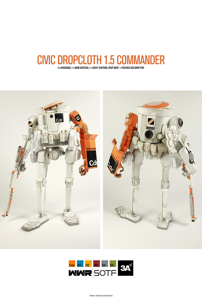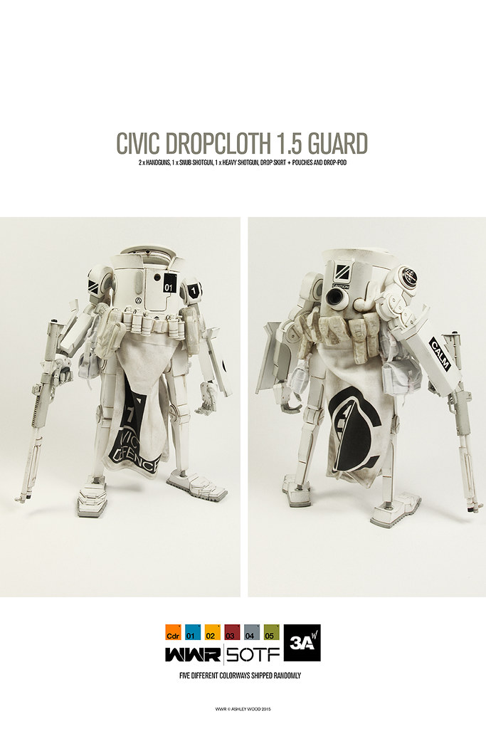 建議售價:單支裝Civic Dropcloth 1.5 Commander 美金160 元、單支裝Civic Dropcloth 1.5 Guard 美金160 元、3AA 會員限定的6 支機械人組合包,包括一款Commander 與五款Guard 美金860 元;商品大小:1/6 比例;開始預購日期:2015 年01月07 日;購買網址:BAMBALAND 網路商店。