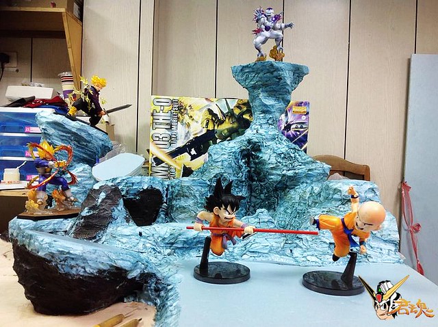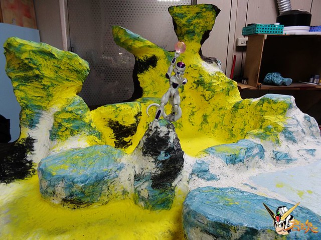 尺寸為80公分X80公分做為地台大小,因為有考慮要放入多隻公仔,各種姿勢跟不同的擺放地點來增加可玩度跟豐富度,所以也不固定公仔位置讓公仔可以隨意擺放變更,當然此種類型的場景也可以放大或作尺寸更小的場景,如…擷取自然地形的一小部分,這是其延展性。