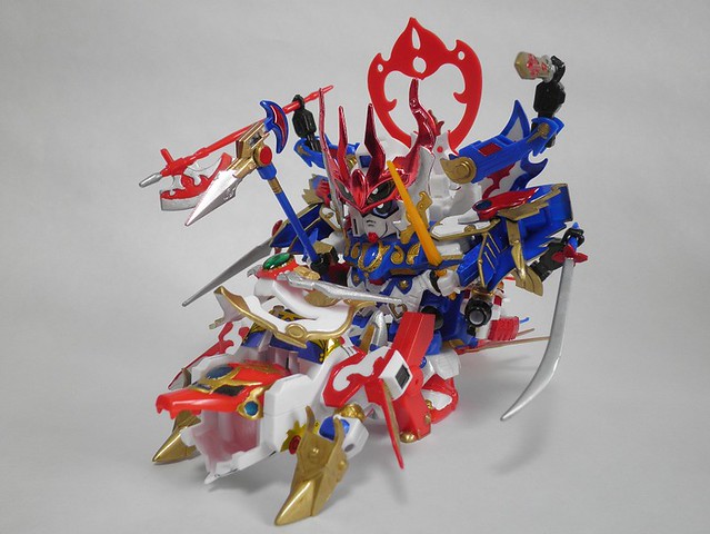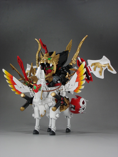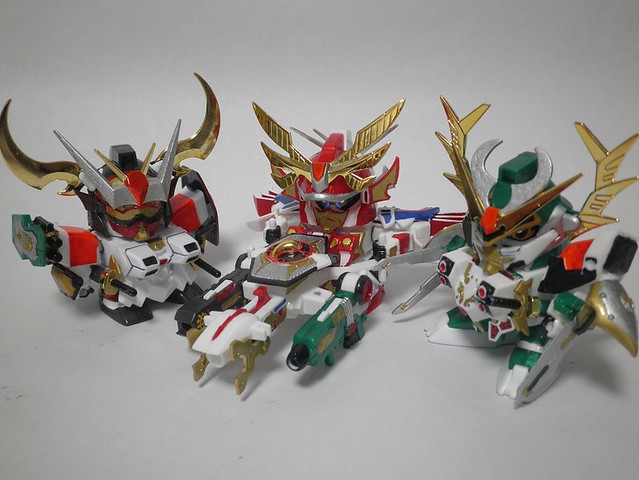 因此,不管是變形成各種動物、交通載具、武器,甚至上下顛倒、前後翻轉、分離重組,在SD鋼彈世界中,任何光怪陸離的設計都是家常便飯。各角色之間的串連合體更是理所當然,尤其每個系列的主角機或大將軍,常常都把伙伴的身體當成樂高積木一樣,二話不說,拆來裝上,就變成新裝甲、新武器、變形合體超進化,真是相當方便,也讓每一組BB戰士增加了許多有趣的新玩法。