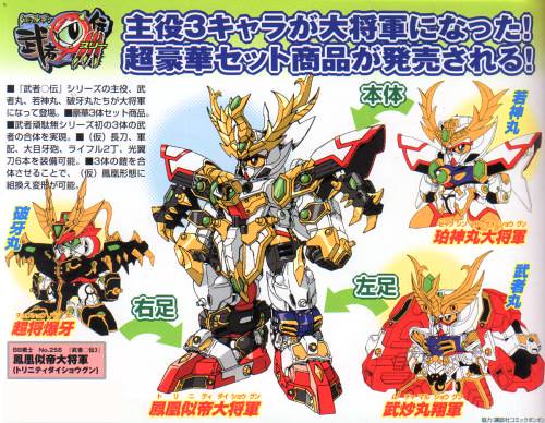 鳯凰似帝大將軍,這是《武者丸傳》三部作的三大主角最終大合體,由武者丸、若神丸、破牙丸三人一體組成的無敵巨神。三人可以輪流擔任主軀體和雙腳三個位置,如果以若神丸為主體的話,會變成神力最強的「鳯凰似帝大將軍」;以武者丸為主體的話,會成為劍術高超的「野突化大將軍」;以破牙丸為主體的話,會成為破壞力十足的「裂驅離大將軍」。
