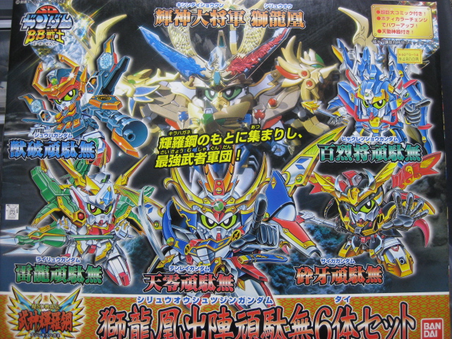 另一個傳說中的夢幻逸品則是《武者七人眾篇》特別為了主要角色推出的「強化武具set」,其中包括聖劍之兜(頑駄無)、龍骨之兜(精太)、三日月之脇立(齋胡)、火之鳥之脇立(摩亞驅)、武者之盾、飛行背包、以及可以將BB戰士NO.8沙剎比改造為武者漣飛威的前立。這也是老玩家才知道的夢幻寶物,不過,一般人大概完全不知道我在說什麼吧?(淚)
