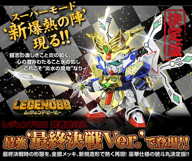 《超機動大將軍篇》中,號斗丸在故事後段獲得了天鎧王給予的「天之神具」,並得到天界武人羽荒斗的認可授與「石破天驚劍」,再習得「炎水境地」成為最終型態,全部最強武具都拿到了,正是Legend BB戰士號斗丸最強最終決戰Ver,這麼厲害的版本不放在Premium Bandai魂商店豈不是太可惜了?