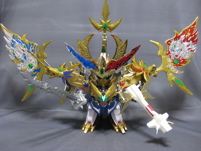 講到合體必殺技,還有一個小編最愛的角色,那就是《武神輝羅鋼篇》最後登場的輝神大將軍獅龍凰,集結天宮(鳳凰)、影舞亂夢(龍)、赤流火穩(獅)三國守護獸力量而成,可以變身為三獸合體的獅龍鳳型態,使用必殺技「閃光輝獸擊」,而大將軍型態則可以使用NO.165武者刀流義守變身的巨大劍與NO.166新凰頑駄無的月光爆星砲,簡直是所有夢想集於一身的完美終極型態啊~~