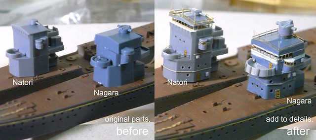 ↑艦橋細節增添前後對照,這裡就可以看出名取和長良的新舊模具的差別了。