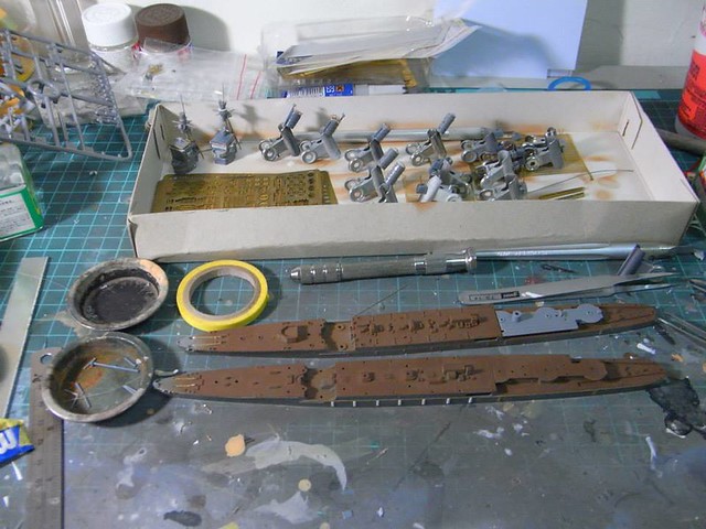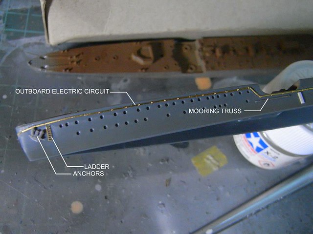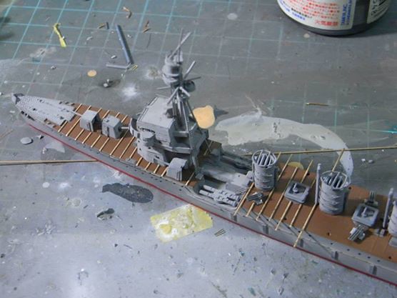 ↑首先先修整艦身,貼上舷外電路與爬梯蝕刻片