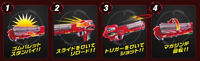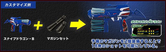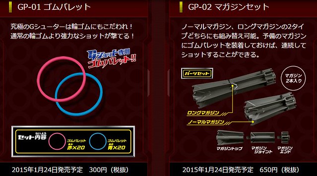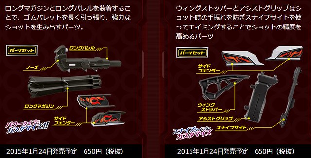 尺寸約W260×H170×D50mm。每隻日幣售價1620日圓,預計2015年1月24日推出。另有專用橡皮筋、彈匣、玩具槍組件可以添購